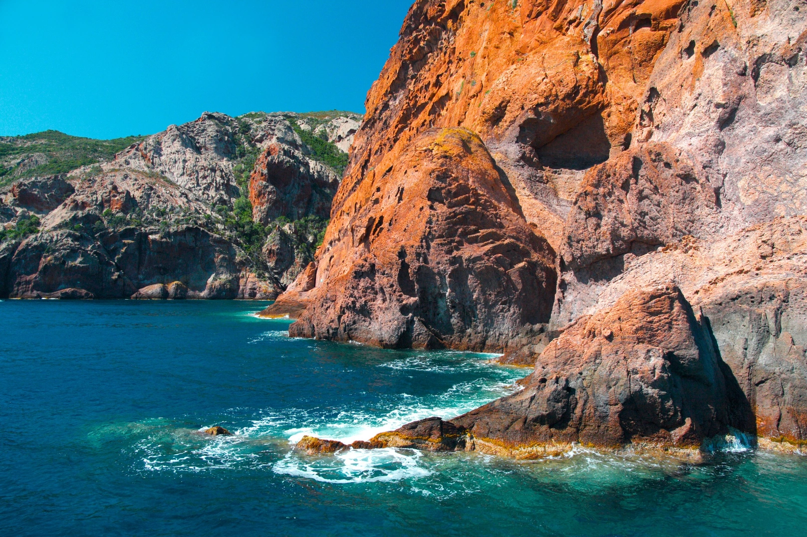 Une journée au fil des merveilles naturelles : grottes secrètes de Scandola, escale dans le village de Girolata suspendu entre ciel et mer, traversée du golfe de Porto et baignade dans les eaux turquoise de Capo Rosso.